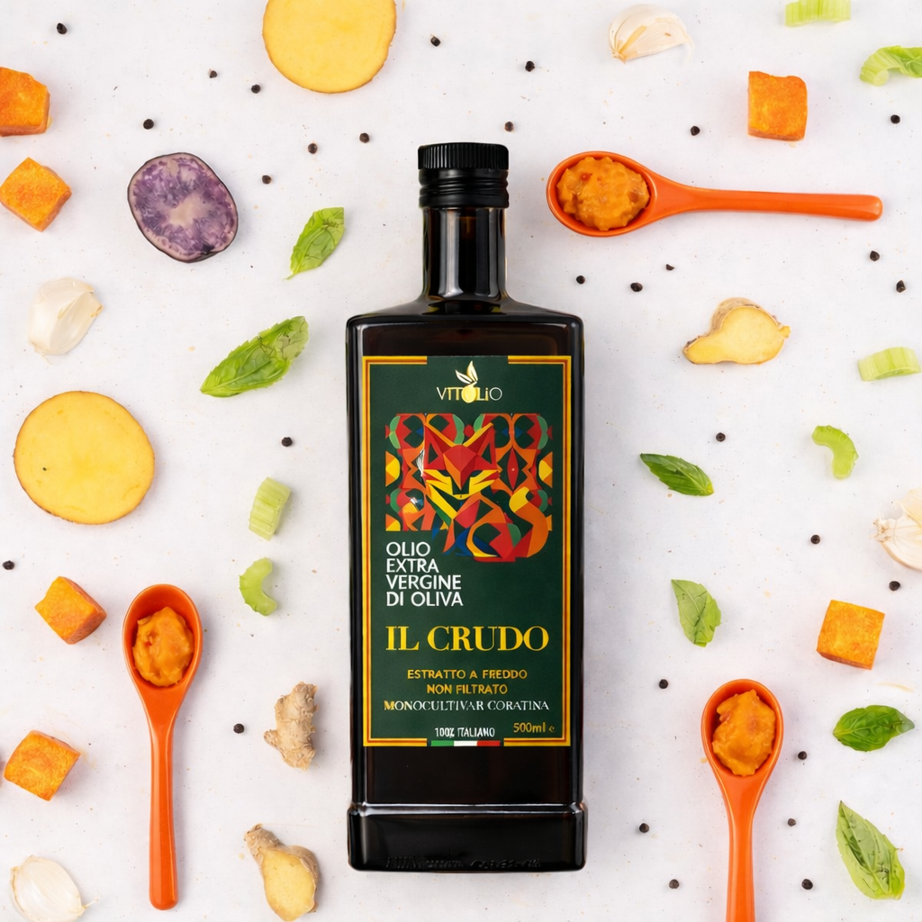 Scopri IL CRUDO in Orcio giallo 500 ml: monocultivar Coratina, estratto a freddo e non filtrato. Ogni goccia racconta la Puglia: intenso, fragrante e autentico. Il formato piccolo è perfetto per gustarlo subito e senza rischi.
